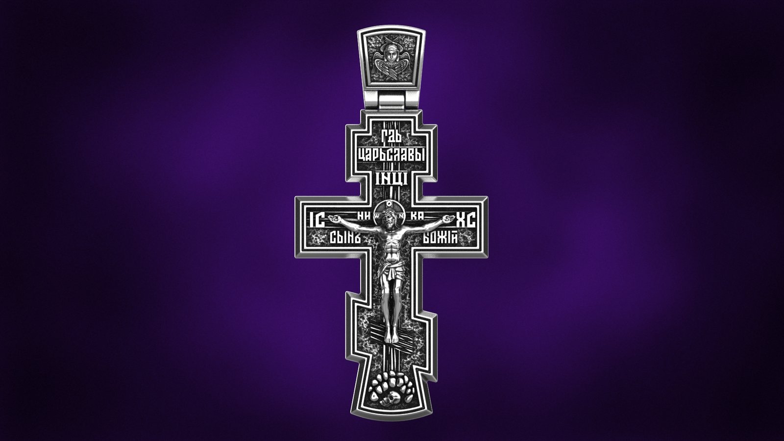 Православний підвіс-хрест у срібному кольорі з чорнінням та детальною фігурою Розп’ятого. На моделі розміщені канонічні написи та декоративні елементи. Підходить для щоденного носіння та як символічний подарунок.