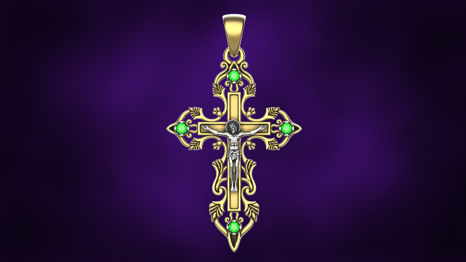 Підвіс-хрест у золотому відтінку зі срібною фігурою Спасителя та декоративним орнаментом. Модель прикрашена чотирма зеленими каменями. Підійде як класичний релігійний аксесуар та подарунок.
